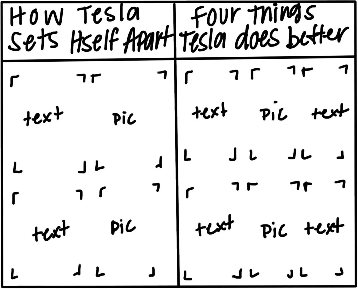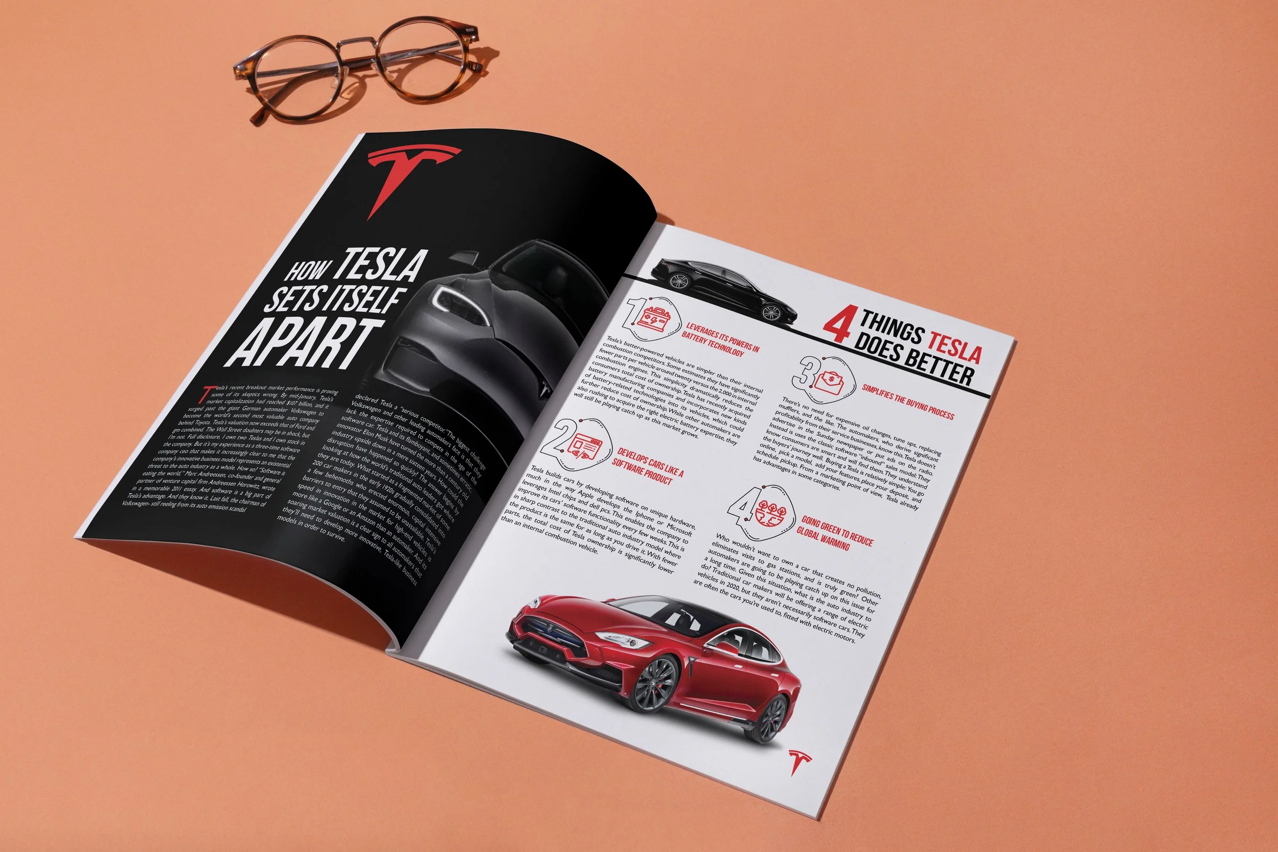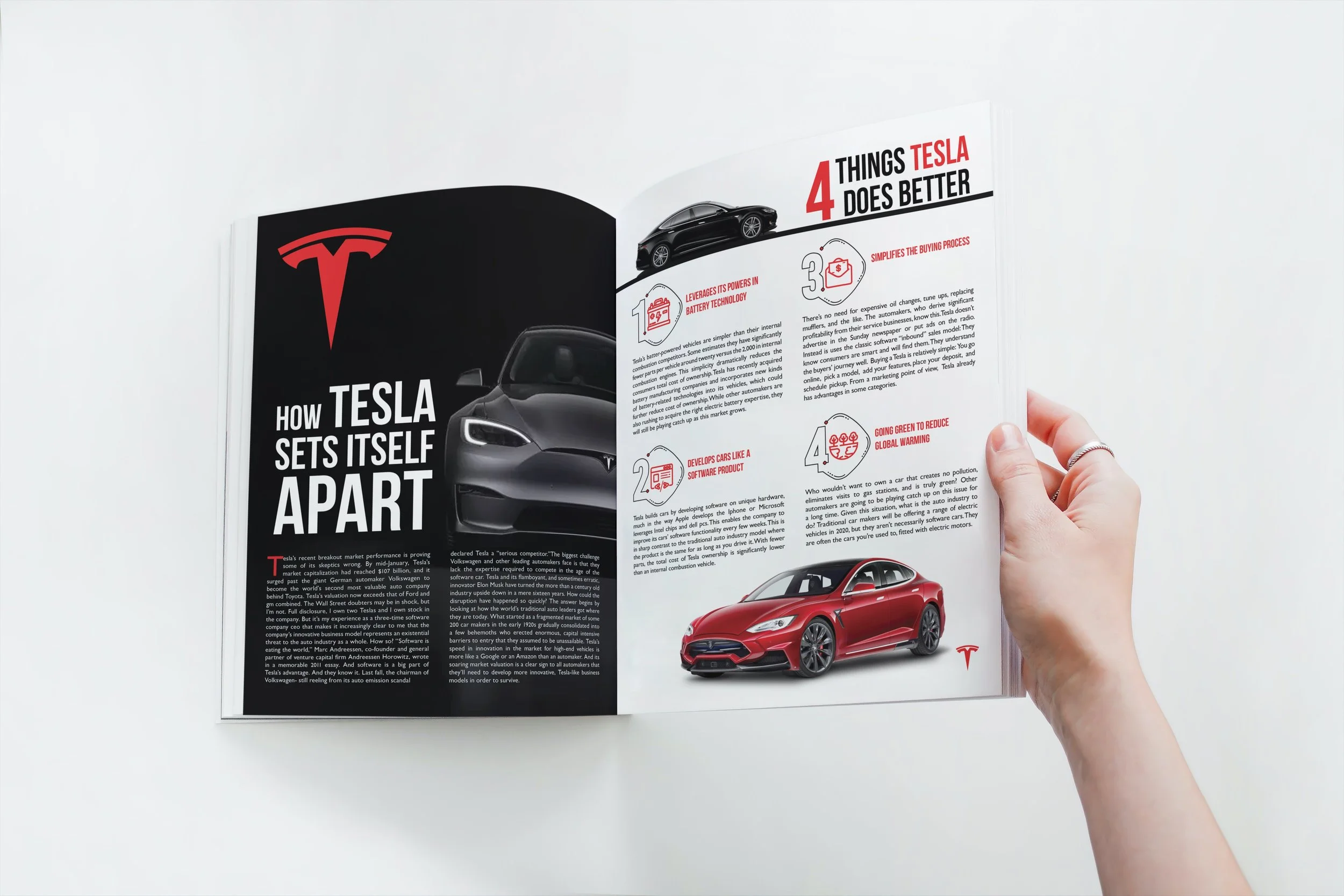 The assets include photographs of Tesla’s manufactured cars, the Tesla logo, and icons that I Illustrated on Illustrator