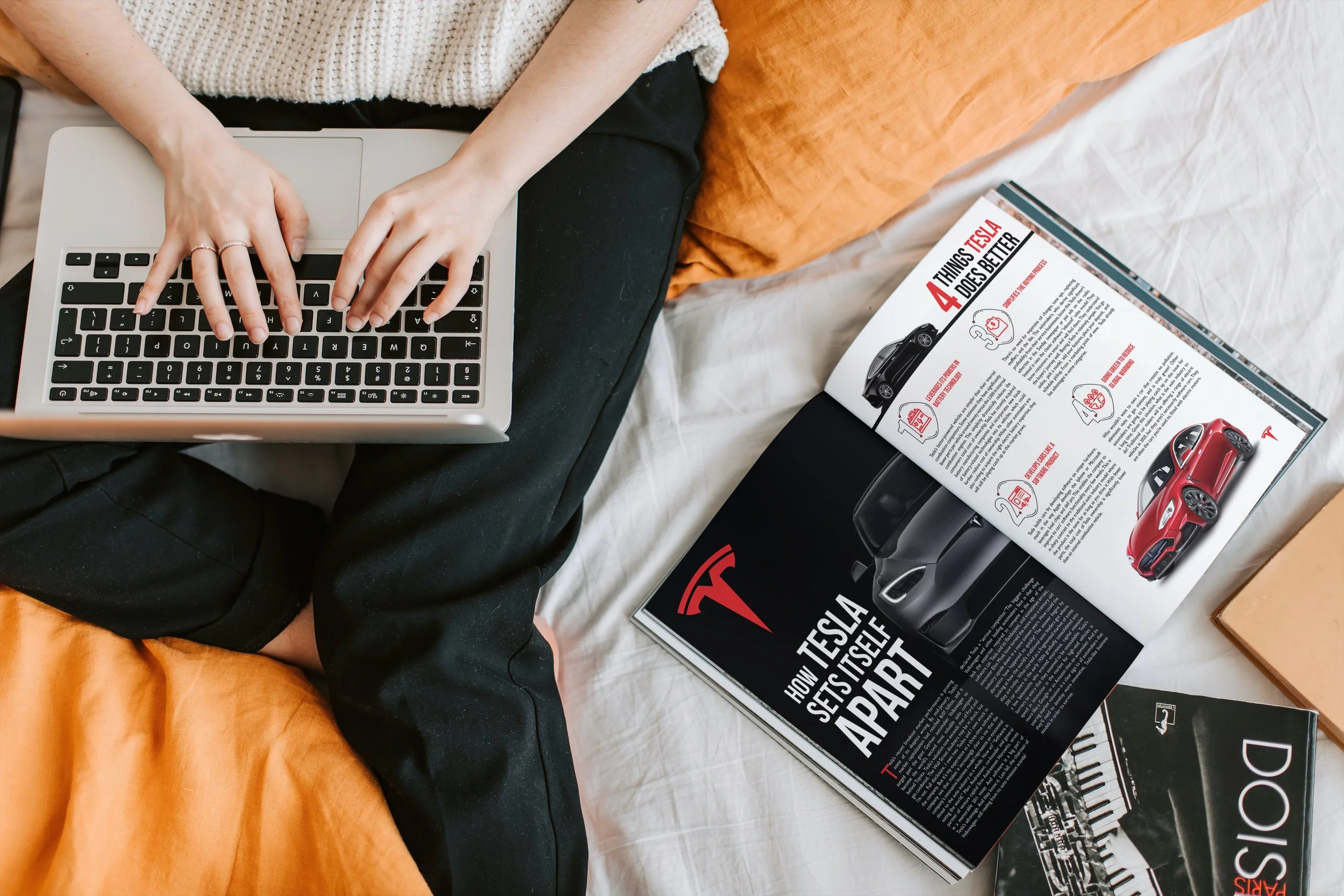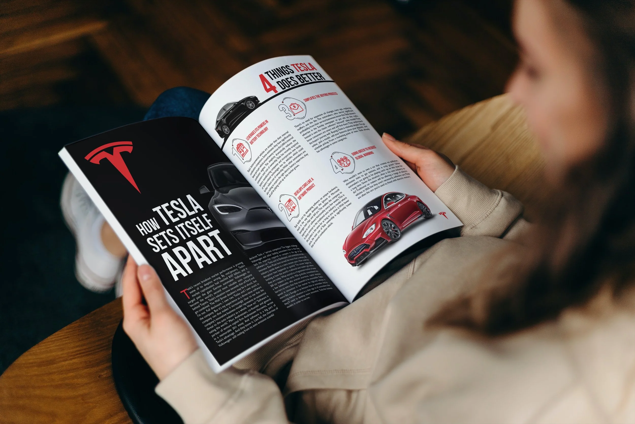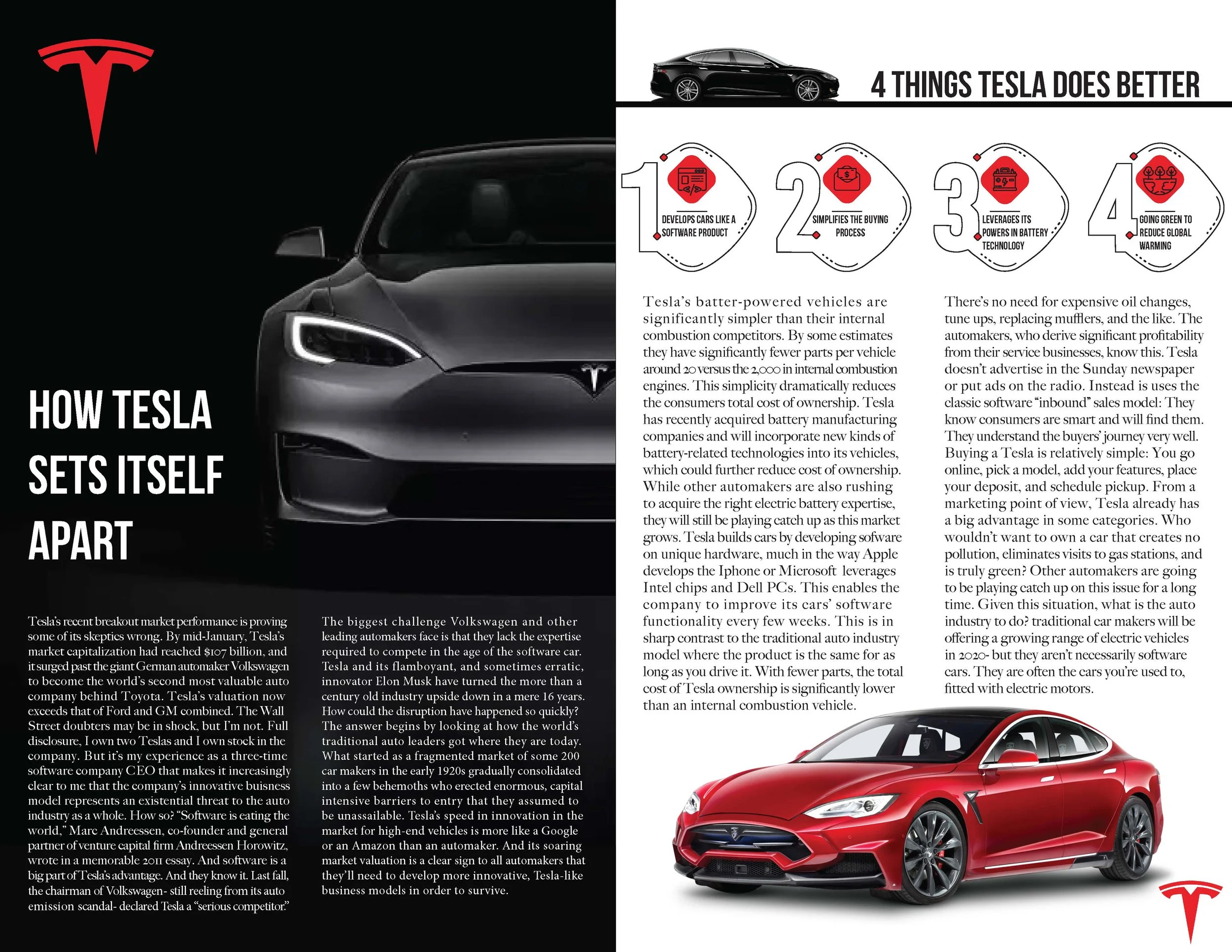 The assets include photographs of Tesla’s manufactured cars, the Tesla logo, and icons that I Illustrated on Illustrator